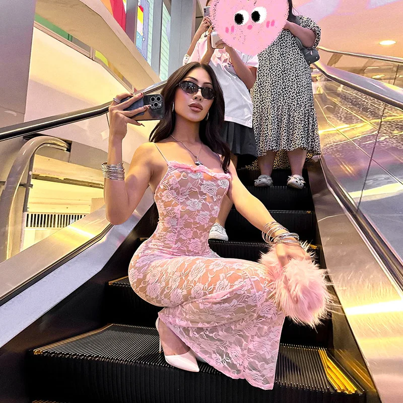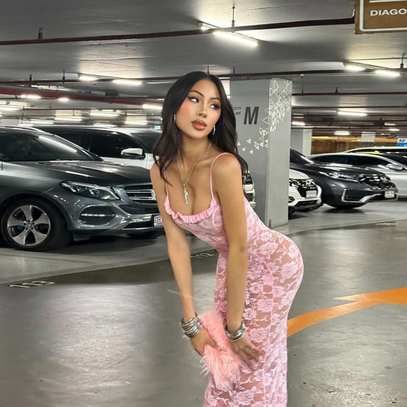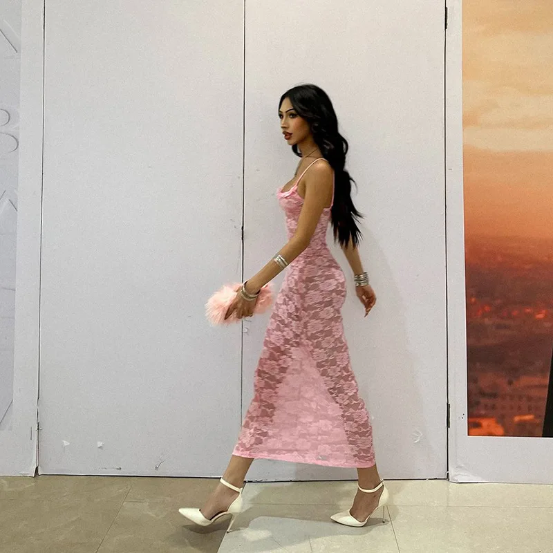JY Summer Sleeveless Cami Lace See Through Backless Dress Falbala Skinny Sexy Maxi Package Hip Dress for Women Lady